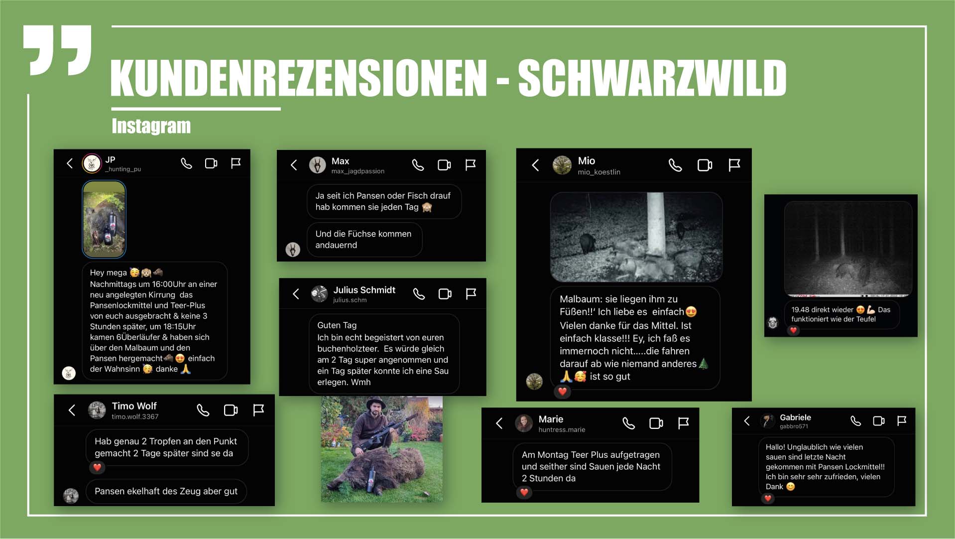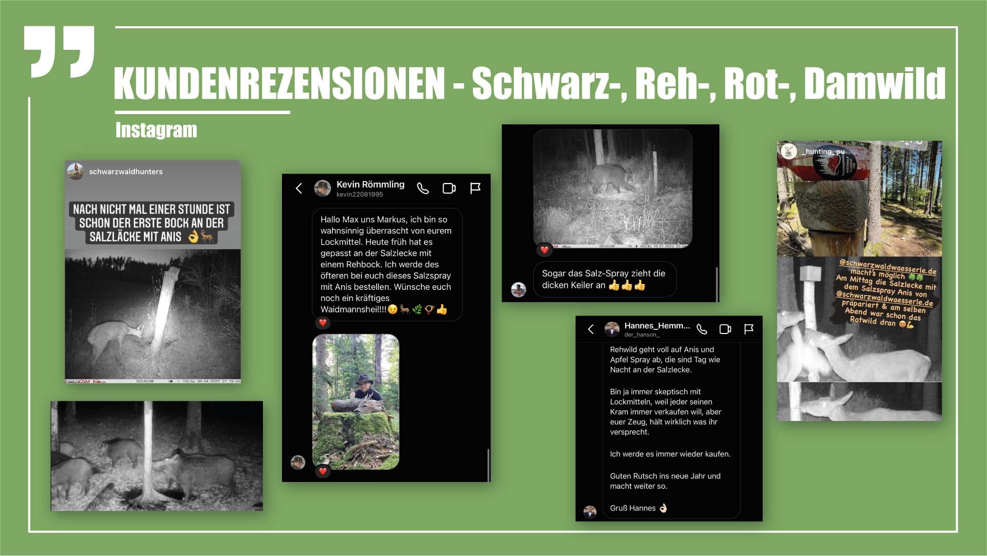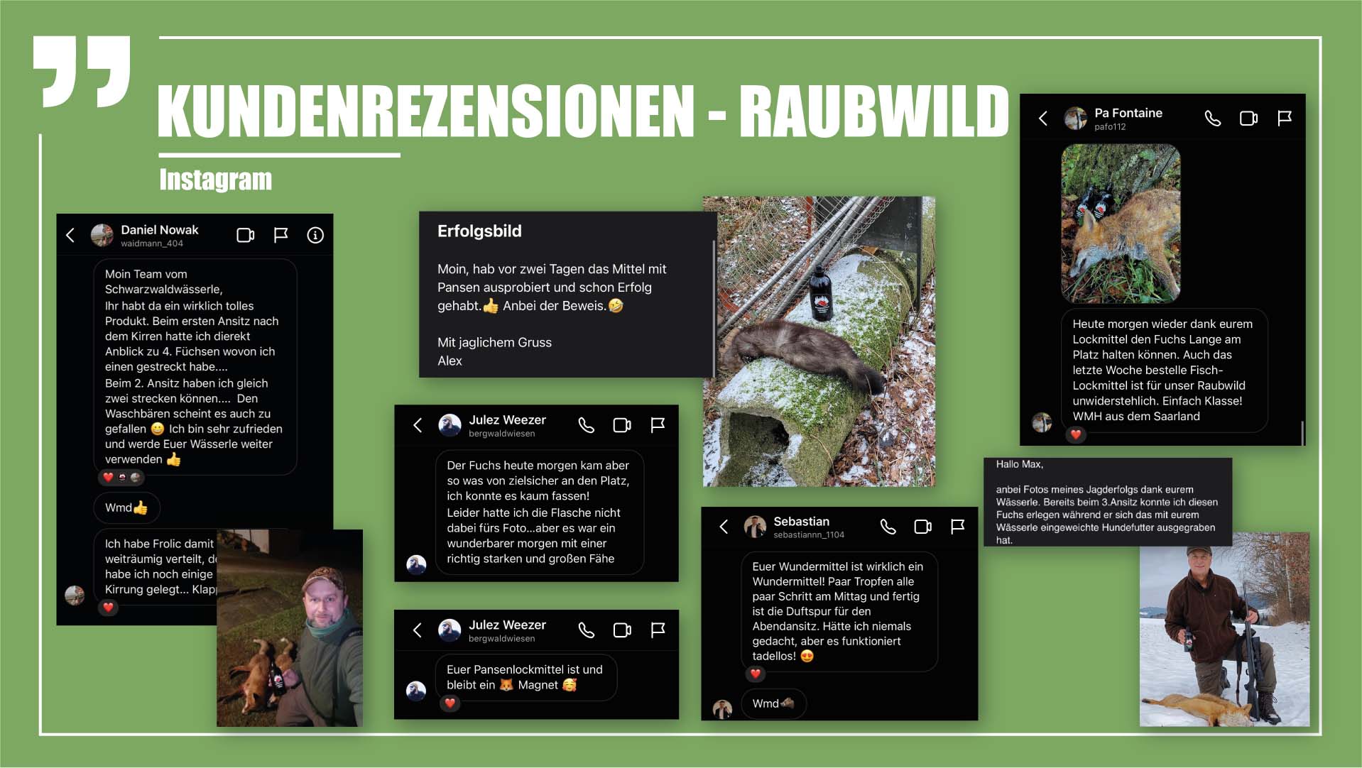 "Ich kann die Produkte zweifelsohne weiterempfehlen [...] Hier passt für mich das Gesamtpaket: Tradition, natürliche und eigene Herstellung , [...] Kundennähe mit Direktvermarktung, Transparenz, Preis und Qualität und was selbstverständlich bei Lockmitteln das Wichtigste ist, sehr gute Wirksamkeit in der Lockwirkung bei den verschiedenen Wildarten."