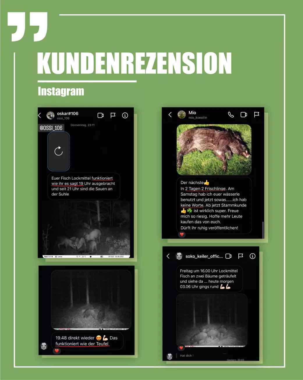 "An den Lockstellen wurden Fuchs, Steinmarder, Waschbär und Schwarzwild abgelichtet. Die Aufnahmen belegen für alle Wildarten ein aktives Interesse in Form von direktem Bewinden der Lockstelle. [...] das Mittel in diesen Fällen pur getestet. [...] Eine Wirkung ist in diesem Fall aber unbestritten."